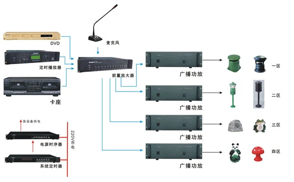 不管哪一种广播音响系统,都可以基本分为四个部分:节目源设备、信号的放大和处理设备、传输线路和扬声器系统。