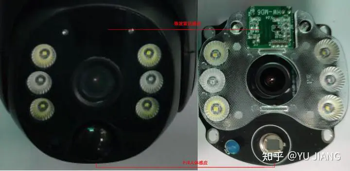 考虑到设备功耗要低,监控摄像机的人体感应报警设备多为PIR人体感应或微波雷达人体感应。为了使人体检测的精度更高,PIR人体感应和微波两种方式有时也同时使用,出现在同一个摄像机上。在 雄迈方案太阳能4G摄像机拆机 一文中对PIR及微波雷达人体感应有过介绍,可以参考阅读。
