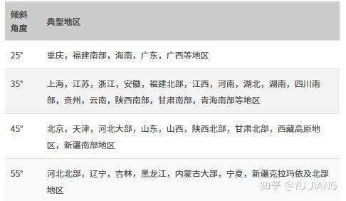 根据安装位置,确定太阳能帆板安装的倾斜角度,以获得最大的太阳能量。总的原则是北半球方位角朝正南方向,南半球朝正北方向。以下是推荐的国内典型地区太阳能帆板安装倾斜角度。