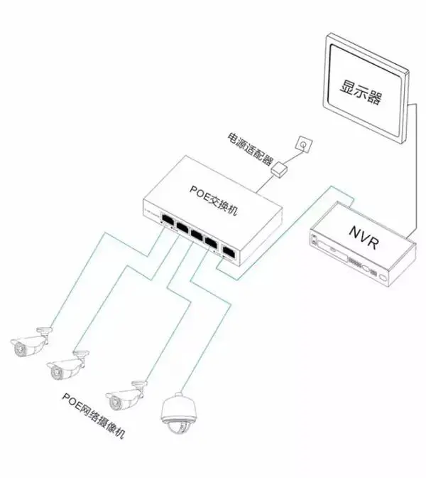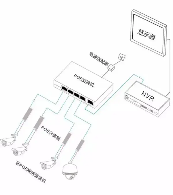 这种方式,PoE交换机通过网线直接连接支持PoE供电的无线AP和网络摄像机。这种方法是最简单的,但是还需要注意以下两点: