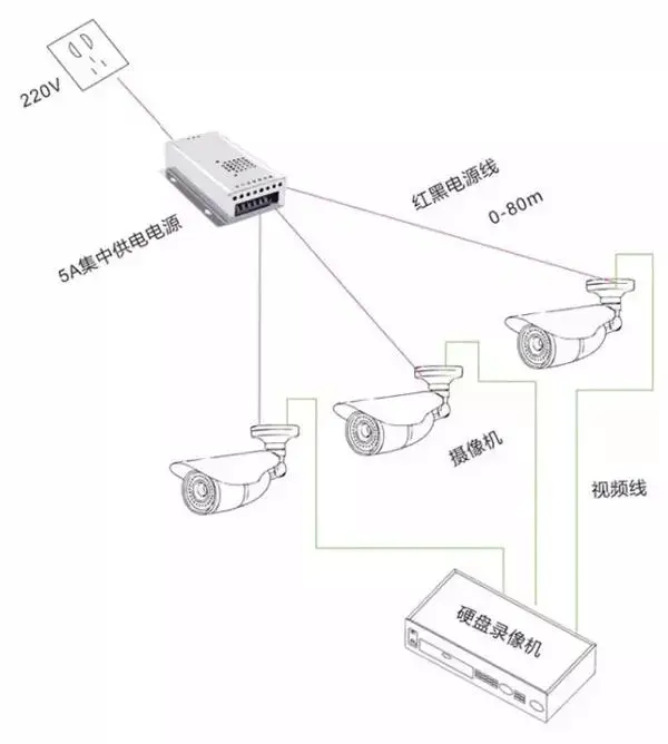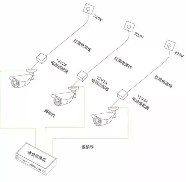 220V电源接1个12V集中电源,然后将2*1.0红色和黑色电源线分别连接到摄像机,12V供电距离不超过100米。连接单电源线连接器后,将单电源线连接器连接到监控摄像头电源连接器。集中供电方式是指在监控室或某个中间点使用12V开关电源向前端负载集中供电。与独立供电方式相比,最大的区别在于一个电源可以为多台摄像机供电。