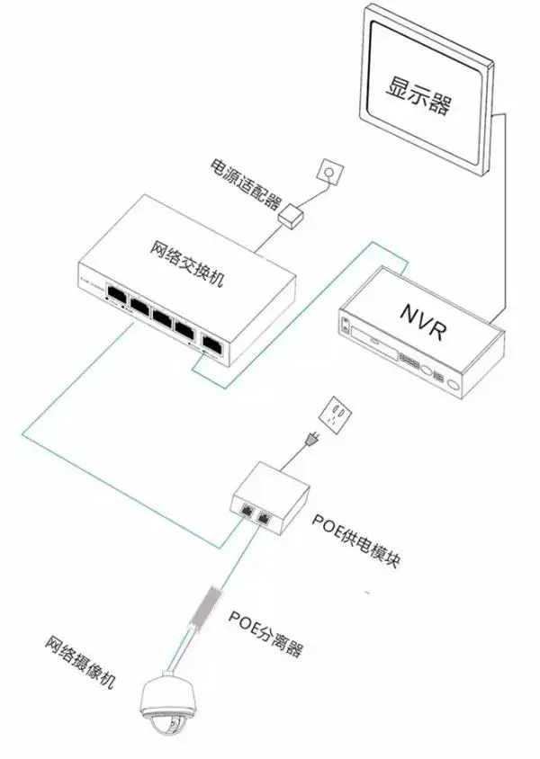 本方案中交换机与PoE供电器相连,PoE供电器给网线加电,传输到终端。该方案有利于扩大原有布线网络,对原有网络无影响。