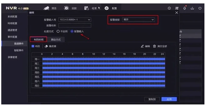 2.报警类型:根据报警输入设备选中对应的报警类型,报警输入是常开就选择“常开”,处理方式选择“报警输入”。