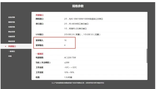 如果还未购买设备,可以在官网搜索设备型号,在规格参数栏查看设备报警输入输出路数: