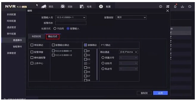 PTZ联动:报警输入可以关联云台设备(PTZ联动),一路报警输入可触发多个通道的预置点、巡航、轨迹调用,但只能调用其中一个(联动状态互斥设置)。