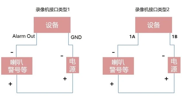 步骤一:录像机上的“Alarm Out”(或1A)接口接报警输出设备的“负极”。