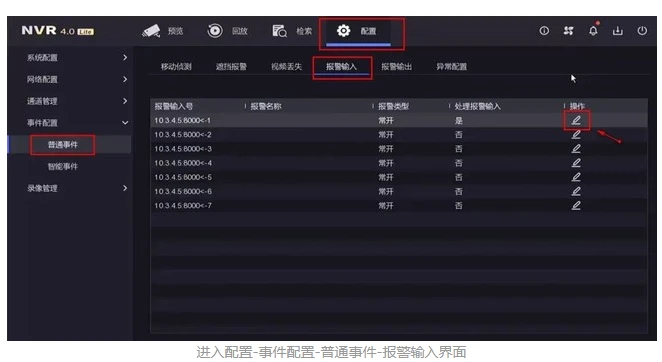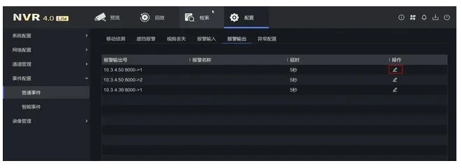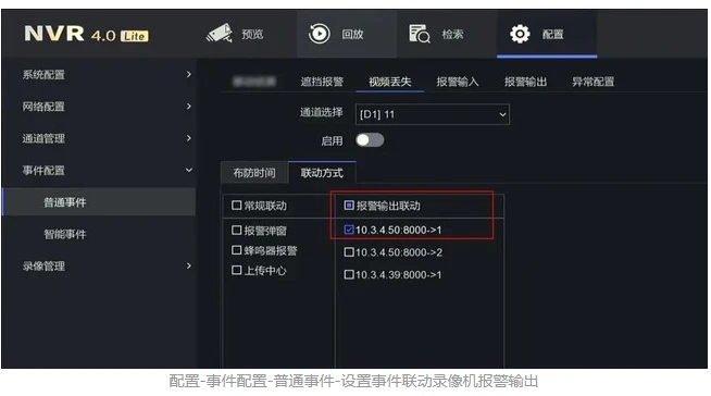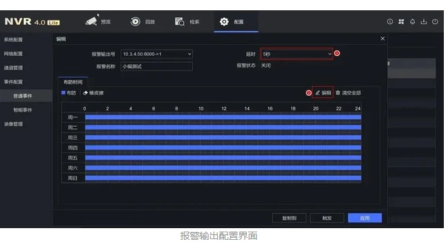 接下来,进入进入录像机配置-事件配置-普通事件/智能事件,在配置事件功能时,选择需要联动的报警输出接口,就可以联动录像机外接的报警输出设备报警了~