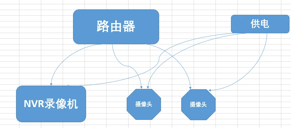 摄像头独立供电+网线传输,视频存储在NVR录像机。