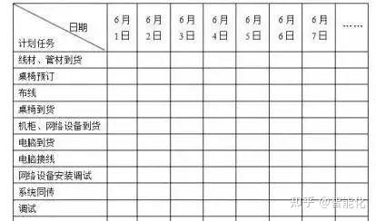 3、制定工程进度计划表。列举施工期间需要完成的工作任务,以及各项工作完成的先后次序,并确定详细的计划时间,如下图所示。工程进度表完成后需交给客户一份,以备客户监督和配合。