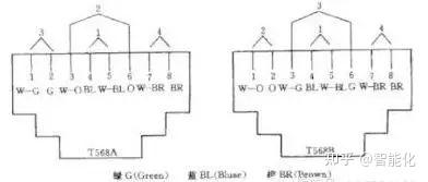 11、 对绞线在信息插座(RJ45)相连时,必须按色标和线对顺序进行卡接。插座类型,色标和编号应符T568A、T568B的规定。如下图所示。
