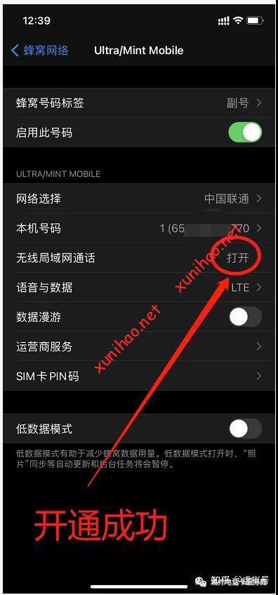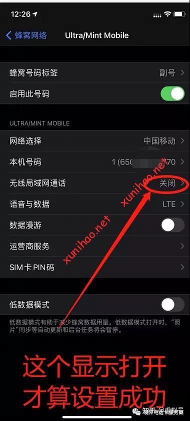 等待wifi calling生效过程中,时不时开关一下飞行模式或重启一下,如果看到如下图的WIFI通话开关正常打开就是成功了,成功后如下图,苹果手机顶部有Wi-Fi Calling字样,24小时还是不行就来找我们。