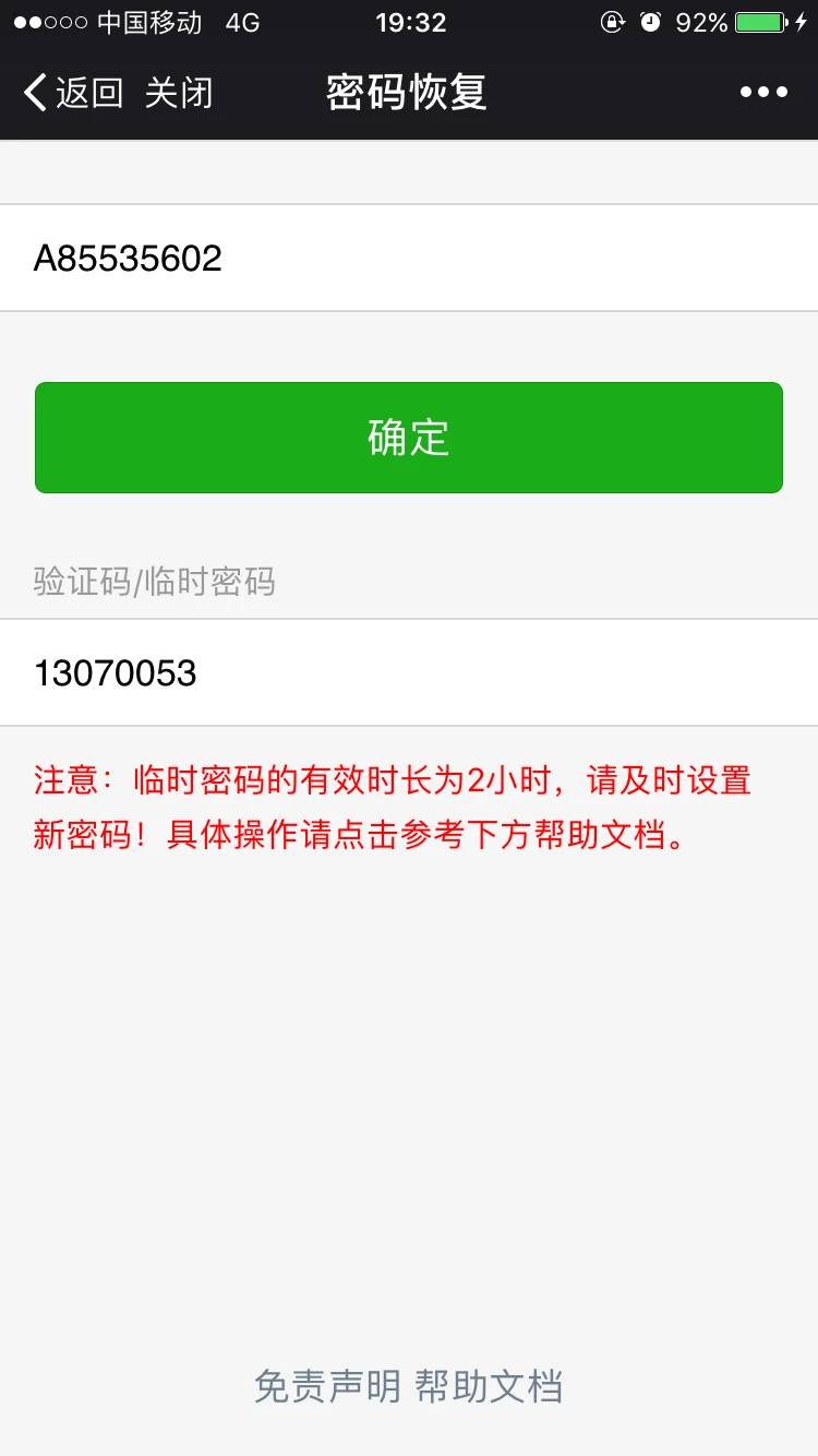 注意:密码恢复串的有效时间是2小时,请及时获取临时密码并设置新密码。