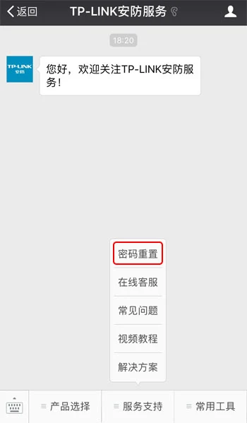 关注微信公众号“TP-LINK安防服务”,点击界面下方菜单“服务支持—密码重置”,注册成功后即可自助找回密码: