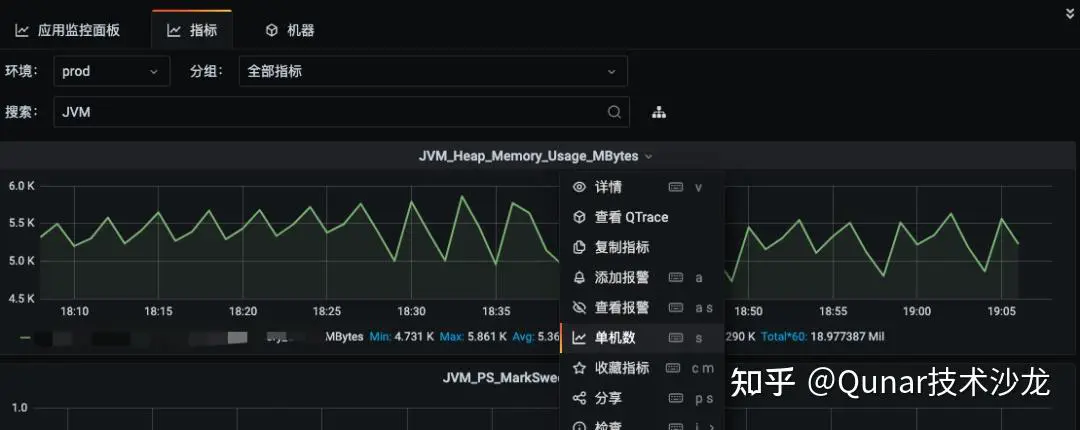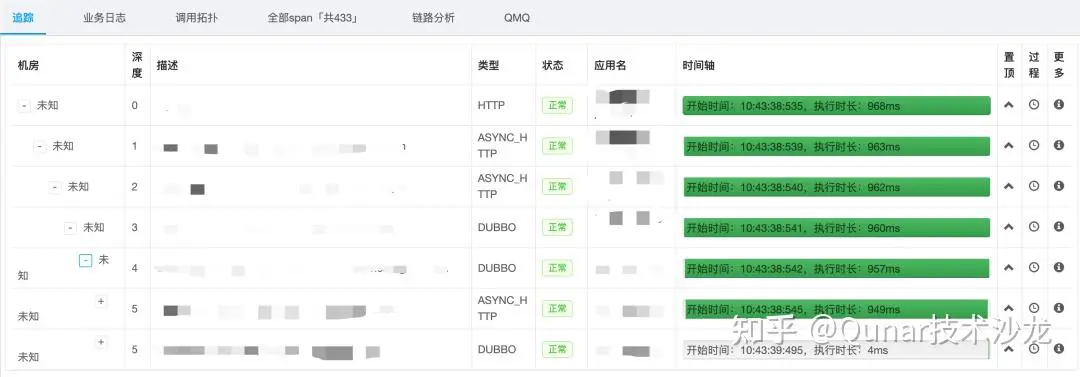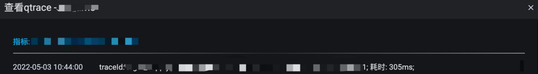 首先 Qtracer 提供了 QTracer.mark() 方法,此方法能够将自己想要的信息关联进当前 trace 的 context 中, 然后在我们自研的 Qmonitor agent 中,在记录指标数据时调用 mark 方法,将当前指标标记进当前的 Trace 信息里面(如果当前有 Trace 信息的话),以此能达到的效果就是一个带着 Trace 信息的请求从入口进来(如果没有携带 Trace 信息,可以生成 Trace),经过了 foo() 方法,而 foo 方法中记录了指标 foo.access.time,那么 foo.access.time 指标会被 mark 到当前 Trace 信息中。