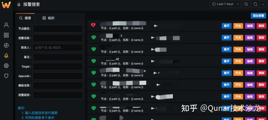 - 报警空间:管理所有的报警,可以快速基于 appCode、指标、联系人等检索报警,以及修改和配置报警。