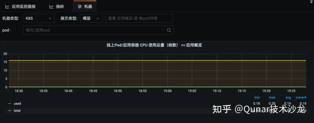我们的 Dashboard 是根据 Grafana 做的二次开发,而 Grafana 本身就支持很多的数据源插件,其中便包括 Prometheus,因此能够很方便的将 Prometheus 跟 Watcher 进行融合,集成后依然提供对用的 Pod 模板查看,允许用户直接通过自己的 AppCode 就能查看到自身应用下当前的 pod 状态,以及应用级的 pod 状态。