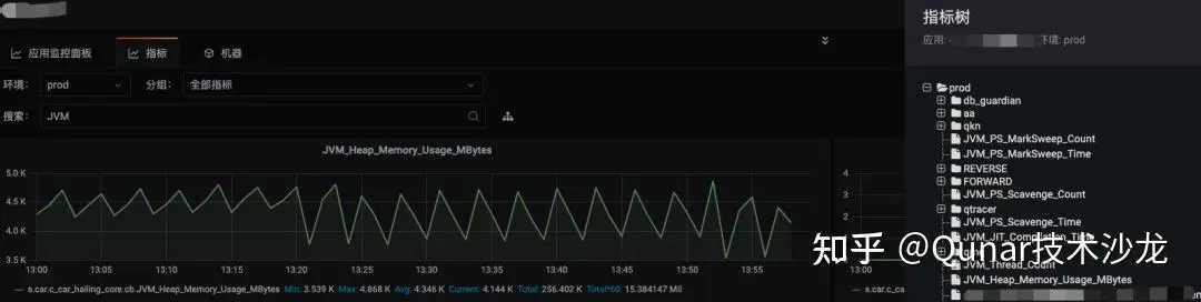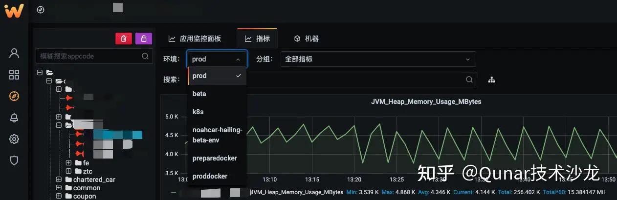 默认情况下,用户可以输入关键字或者正则来快速检索自己的指标,如上图,但如果实在忘记了自己的指标名,也是点击搜索框后面的指标树来浏览自己当前应用当前环境下的所有指标的。 如下图: