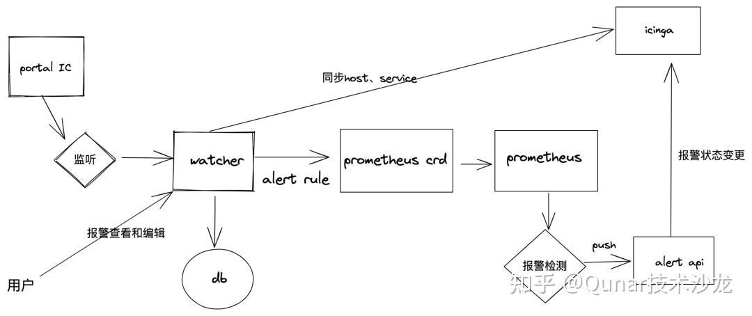 容器的告警像 kvm 一样,也支持模板化,容器通过监听事件来将模板应用到对应 AppCode 上实现动态添加告警,模板包括了检测指标、检测规则、告警阈值等信息。由于 Prometheus 自身支持异常检测,因此可直接将告警规则通过 prometheus crd 同步到 prometheus,通过配置, Prometheus 检测到异常后,会将异常信息 Push 到 我们自研的 Alert-API 模块,Alert-API 可以说是 prometheus 到 icinga 的一个转换器,Icinga 是我们真正的告警管理模块,支持开关报警、告警升级等策略,Icinga 类似 Nagios,但是 icinga 提供了更友好的 API 操作入口。