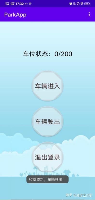 系统的主功能界面,拥有车辆驶入、车辆驶出和退出登录三个按钮,点击不同的按钮即进入对应的功能,上方的状态栏显示当前停车场停放情况。