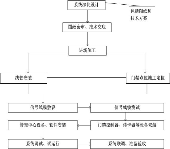 门禁管理系统施工主要包括三个阶段:施工前准备,设备安装,完成调试阶段。