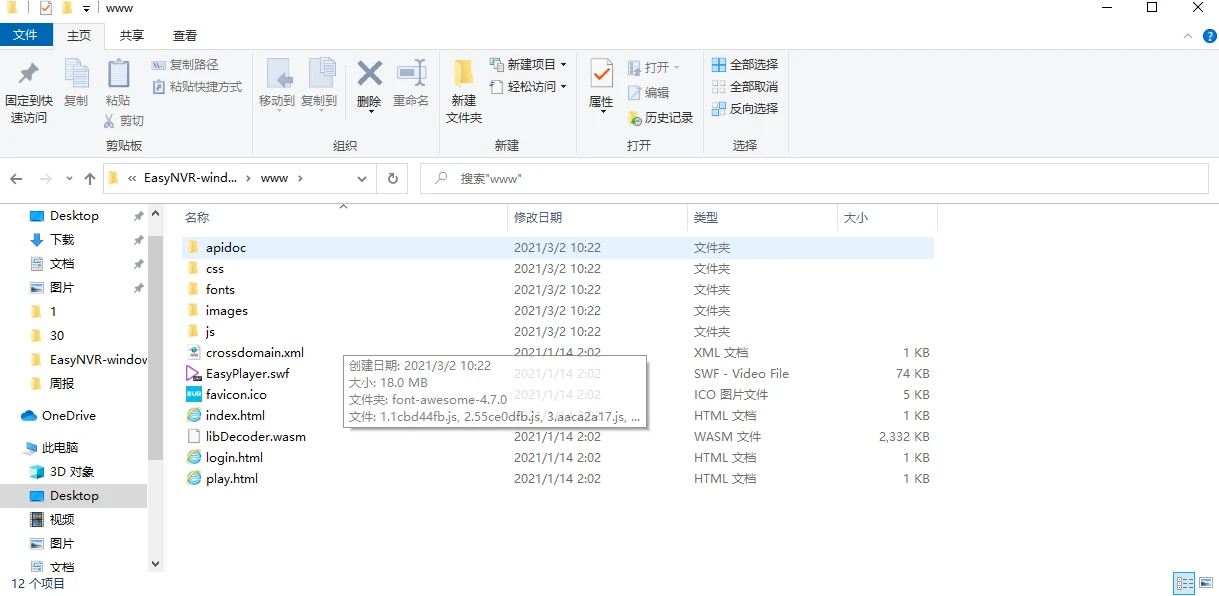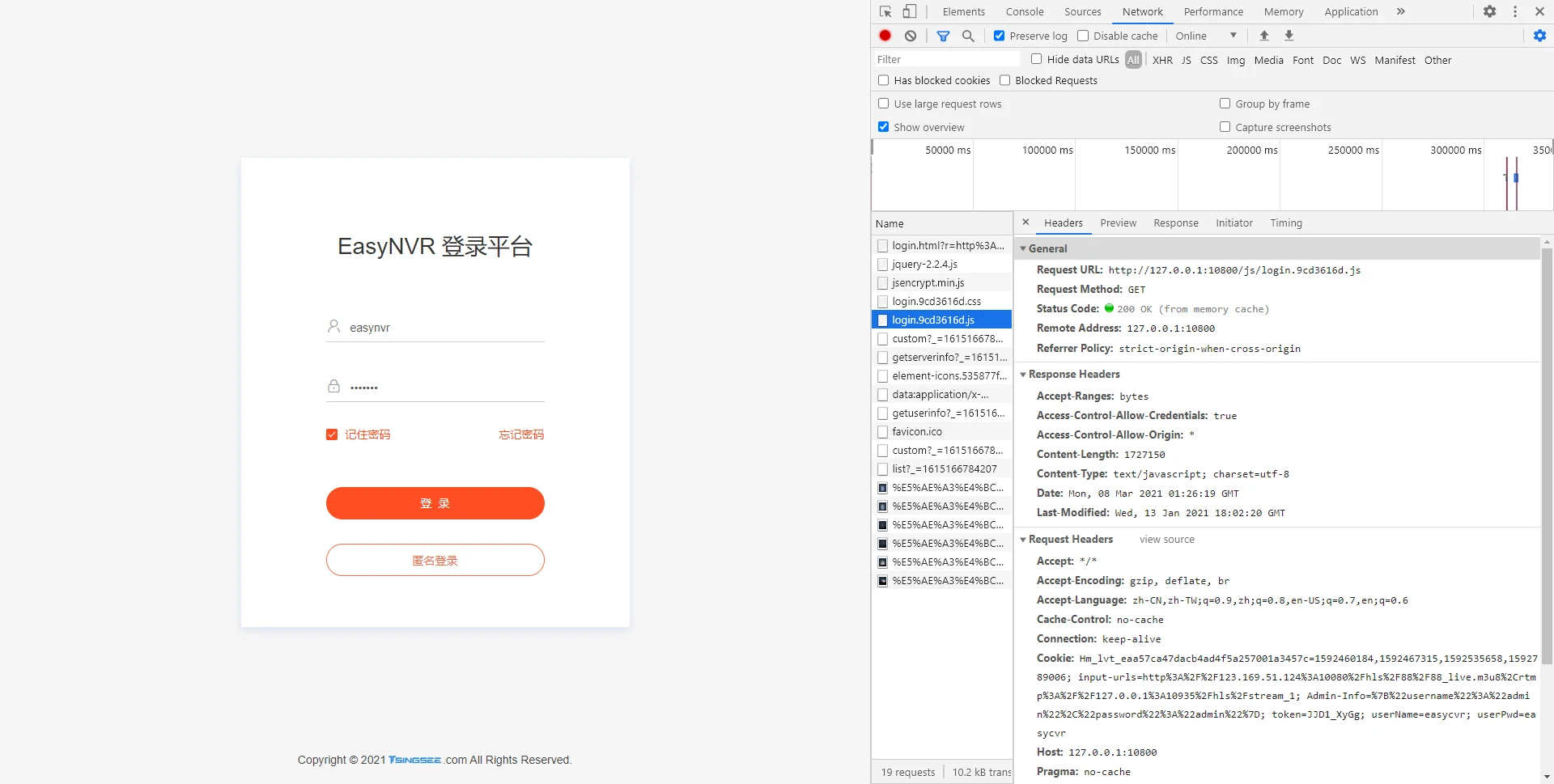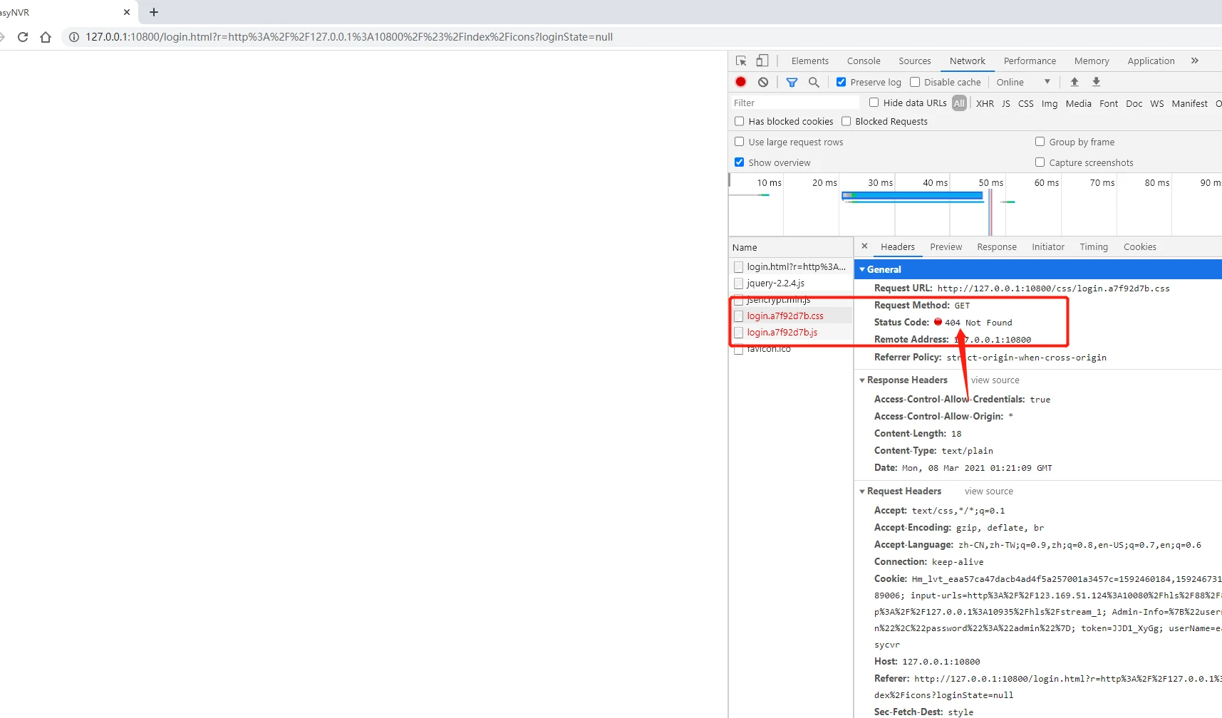 此时发现前端的控制台返回404not found的错误,404就是无法找到相对应的页面进行显示,所以我们下一步就是检查EasyNVR前端的WWW是否正常。