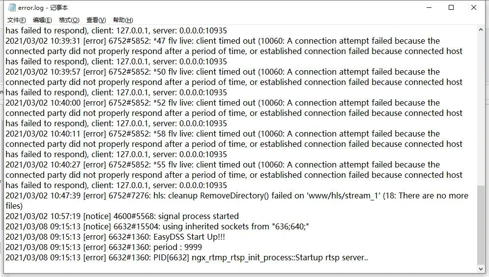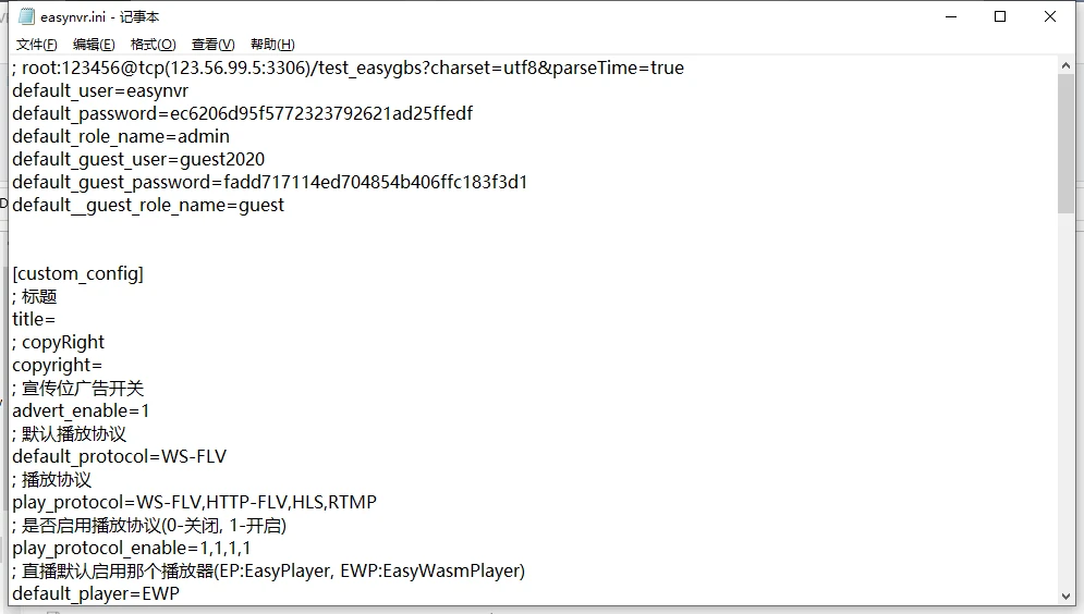 在配置文件内,发现少了一个base_config的字段值,这个整个字段都被删除了,所以我们需要将正常的easynvr.ini配置文件内的base_config字段值拷贝到现在使用的配置文件内,随后重启让新的配置文件生效,重启后则可看到报错消失,运行正常。