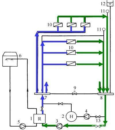 夏季供冷时 :下图所示,冷水机组1制出的7℃冷冻水,在冷冻水泵3的作用下送至分水器7,然后由分水器通过各供水支管分别送至各空调房间或区域的空调设备10。