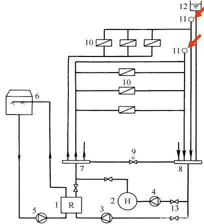 水系统中管道的高处容易积聚空气。当管道内存有空气时,会形成所谓“气堵”,影响水的流动。图中自动排气阀11是为随时排除系统内的空气而设置的。