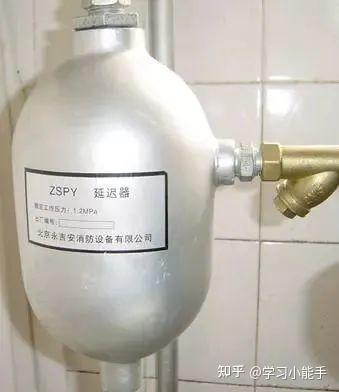 (4)延迟器:是一个罐式容器,安装在报警阀与水力警铃之间。主要是用来防止由于水压波动原因引起报警阀开启而导致误报火警。报警阀开启后,水流需要经30S左右充满延迟器,然后方可打响水力警铃。