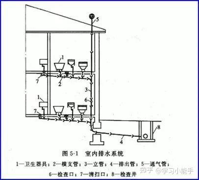 2、排水管道系统由连接卫生器具的排水管道,有一定坡度的横支管、立管、埋设在室内地下的总横干管和排出到室外的排出管等组成。