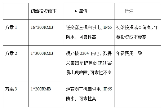 介绍以上三种方案后,我们以一个1MW工厂屋顶分布式电站(选用16Pcs60kW组串式逆变器,全部以GPRS通讯方式进行监控,各GPRS模块年费一致)案例来进行监控方案对比分析,对比数据很直观地显现出来: