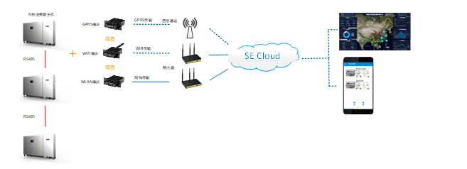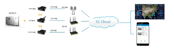 该方案中,每台逆变器必须配置一个通讯配件(GPRS/Wifi/WLAN模块),系统配置原理图如下: