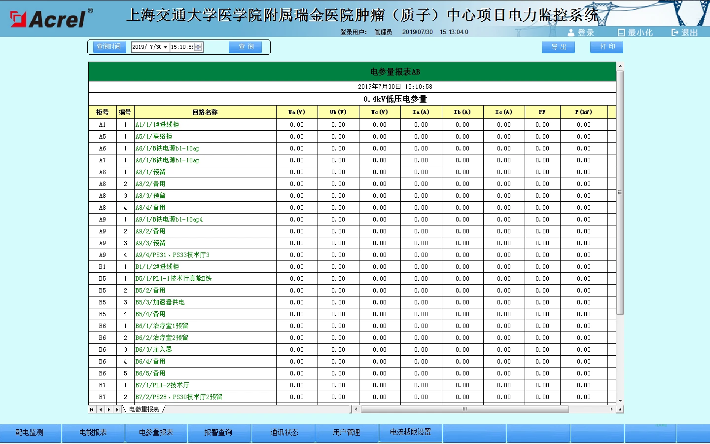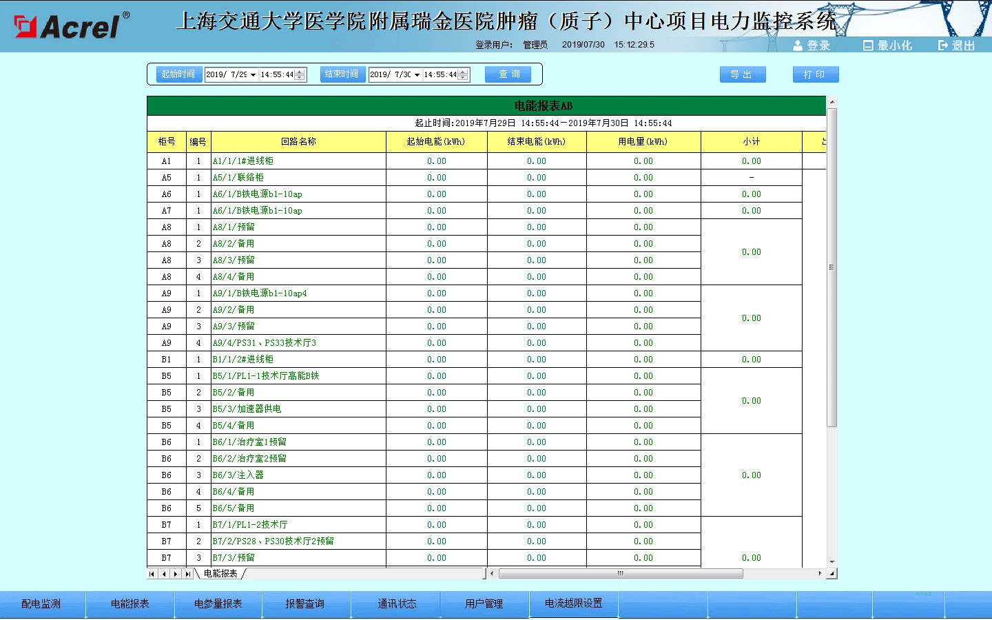 主要功能:具有起始时间和结束时间的时间选择框,选定想要查询的时间段后,通过点击查询按钮可查询出系统项目范围内所有配电回路的用电量。可通过导出按钮将报表以Excel形式导出保存,通过打印按钮进行报表打印。
