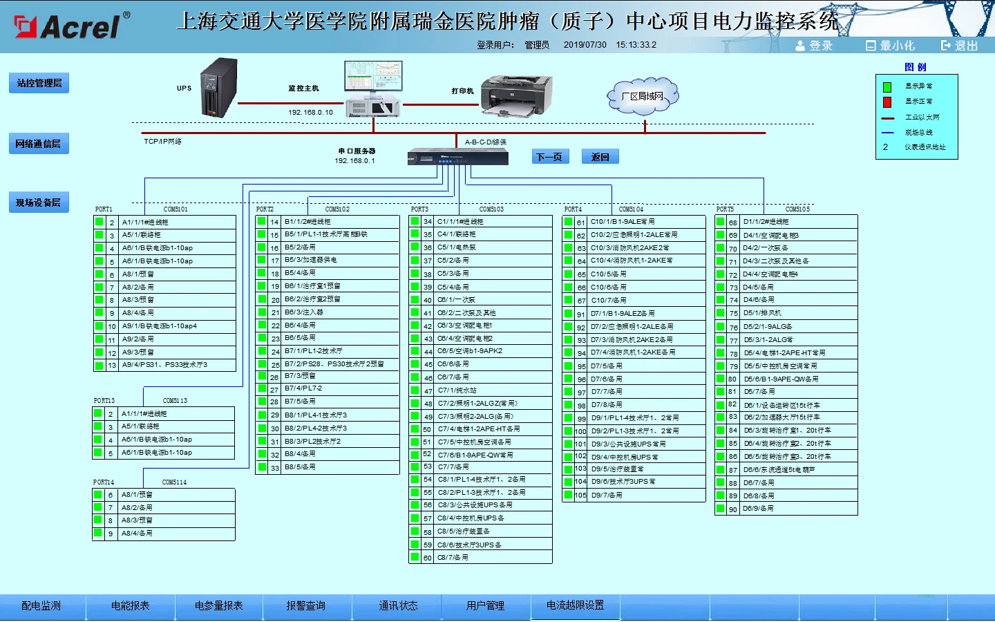 摘要:介绍上海交通大学医学院附属瑞金医院肿瘤(质子)中心项目,采用综合保护装置、多功能仪表、变压器温控仪、直流屏,采集配电现场的各种电参量和状态信号。系统采用现场就地组网的方式,组网后通过现场总线通讯并远传至后台,通过安科瑞电力监控系统实现变电所变配电回路用电的实时监控和管理。