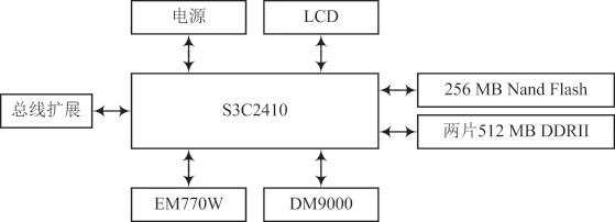 本文系统硬件设计的主控板包括 Samsung 公司的S3C2410 集成芯片、1 024 MB DDRII 存储器、256 MB SLC型闪存、电源管理单元、LCD 显示、网络控制器 DM9000、华为 3G EM770W 无线通信模块 [5]。室内环境系统硬件框图如图 2 所示。