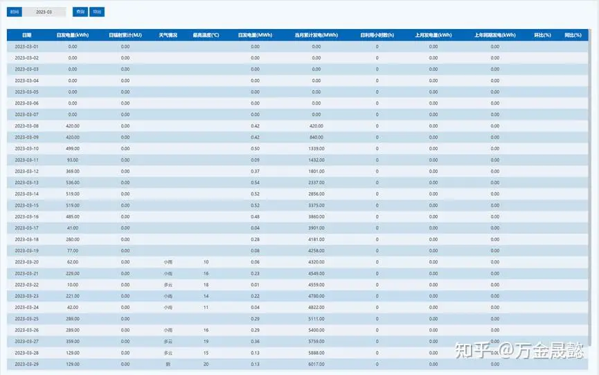 在“发电月报”中,用户可查看单个站点的每日的发电量、辐照量、当天天气、当天温度等数据信息。