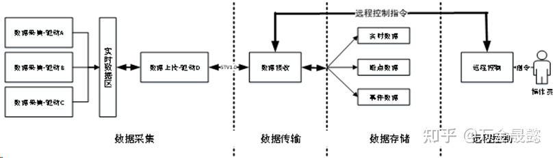 系统按照完整的数据链将流程分为:数据采集、数据传输、数据存储和远程控制四个部分。数据采集层与各类传感器设备进行数据的直接通讯和交互,它们是工作在最底层。数据传输层使用TCP SOCKET方式,并采用上行协议将数据传输到服务器。数据存储层是整个应用的核心,也是系统建设中的重点内容。远程控制层是根据项目实际需求添加的功能,远控由WEB前端发出指信,转交由前置通讯服务器后发送到设备端,由设备执行控制命令的动作,并及时反馈控制结果。四个工作模块的协同工作流程示意图如下: