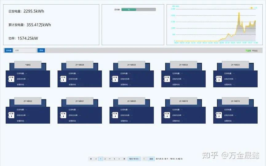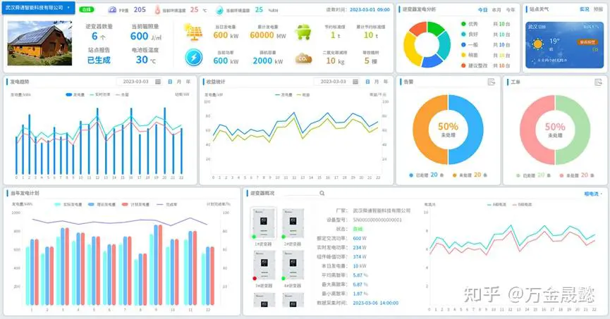 可实现对光伏系统的全景监测。对光伏系统的概览、运行数据、运行指标、发电功率、发电量进行采集监控与展示。 1)光伏系统监控包括并网点开关位置、并网点开关保护动作、光伏限功率调节使能、光伏故障/告警状态、光伏故障/告警状态、光伏紧急停机状态、光伏停机状态、光伏停机状态、光伏运行状态、光伏限功率运行状态、光伏总发电量、光伏日发电量、并网点有功无功功率、并网点电压电流、并网点功率因数频率等数据的监控。 2)汇流箱数据监控包括汇流箱每路电流、汇流箱每路电压、汇流箱每路故障信号等数据的监控。 3)逆变器监控对逆变器的运行数据进行采集监控,包括对逆变器运行状态、逆变器故障信号、逆变器直流输入功率、逆变器直流输入电压、逆变器直流输入电流、逆变器输出功率、逆变器输出电压、逆变器输出电流、逆变器输出电压频率、逆变器功率因数等数据采集监控与展示。