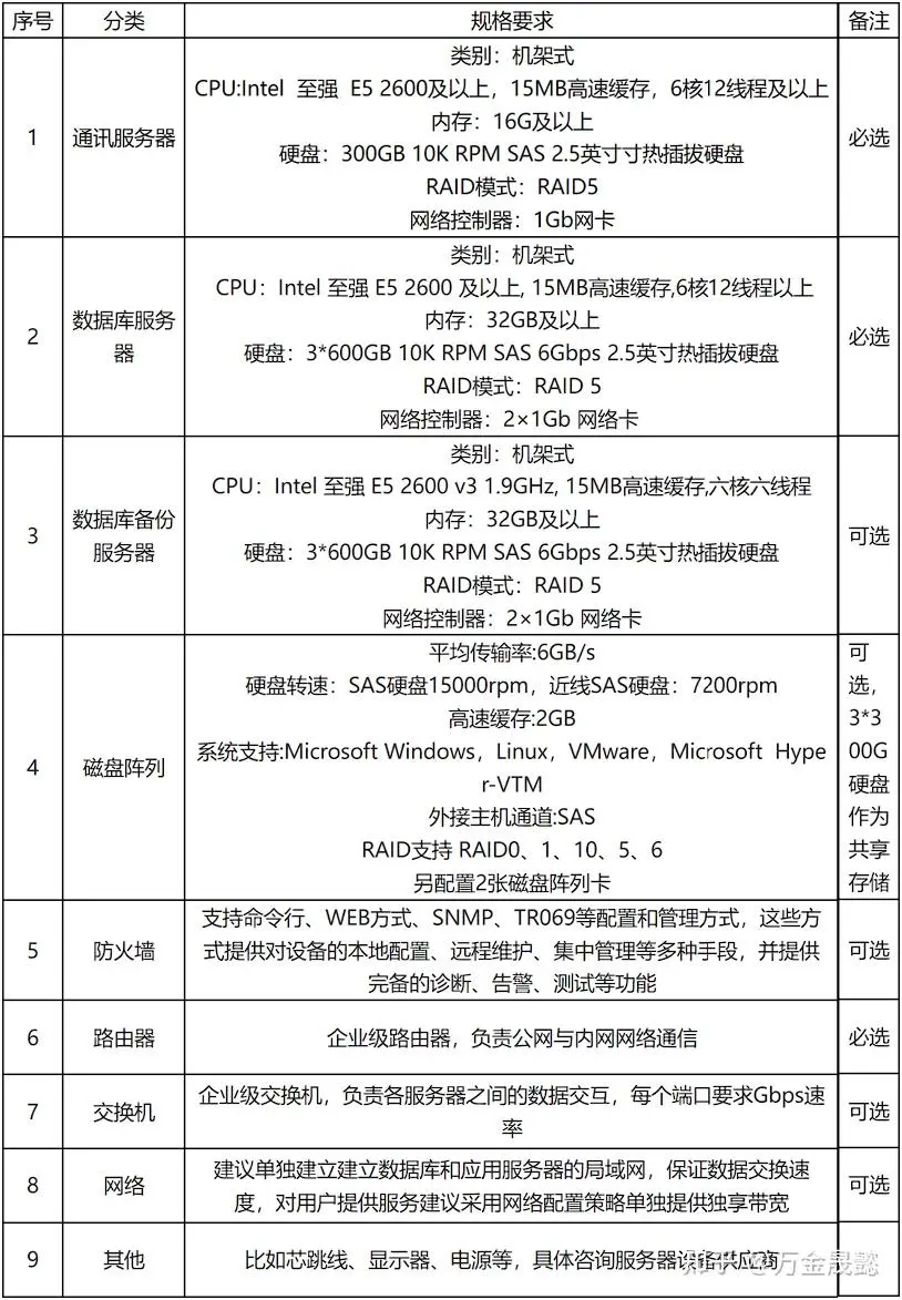 | 1 | 网络带宽 | Internet必须具有独立固定IP,网络带宽要求在20M以上(根据设备接入量和平台访问量适时增加带宽) | 必选,为保证系统运行效果,尽量专网专用,独享带宽,不要将专网共享给其它场景使用 |