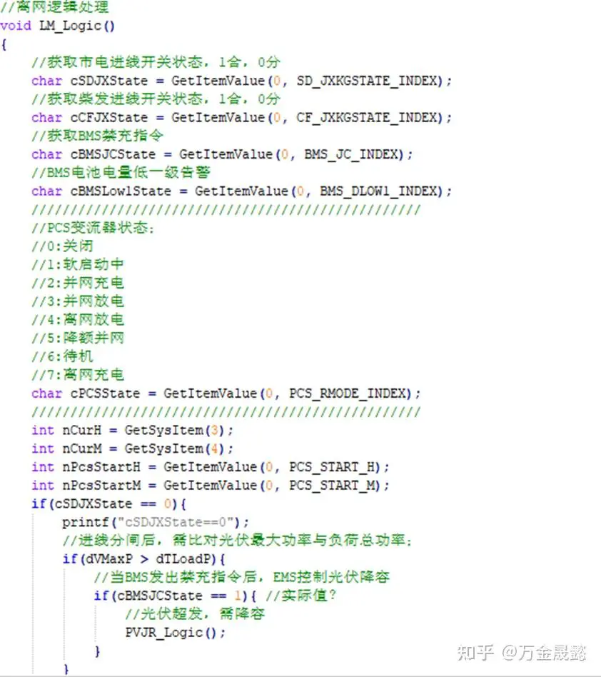 离网控制逻辑主要处理在没有市电参与情况下的孤岛运行模式。实现稳定的自发、自储、自销调控;具体的运行逻辑如下图所示: