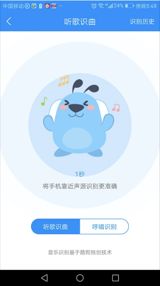 该功能采用酷狗自研的识别算法,在安静环境下能做到一般三秒以下,最快0.8秒就能根据音频片段识别出对应的歌曲名。