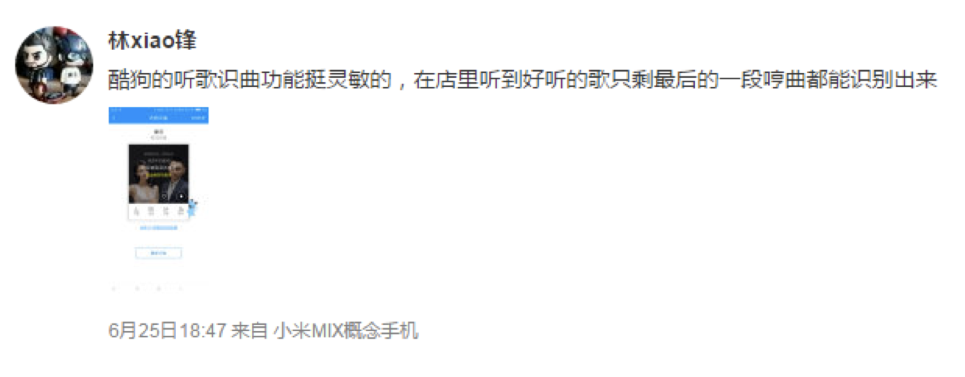 该功能搭乘酷狗的海量曲库,能做到市面上95%以上播放的音频都能搜索到并返回给用户。